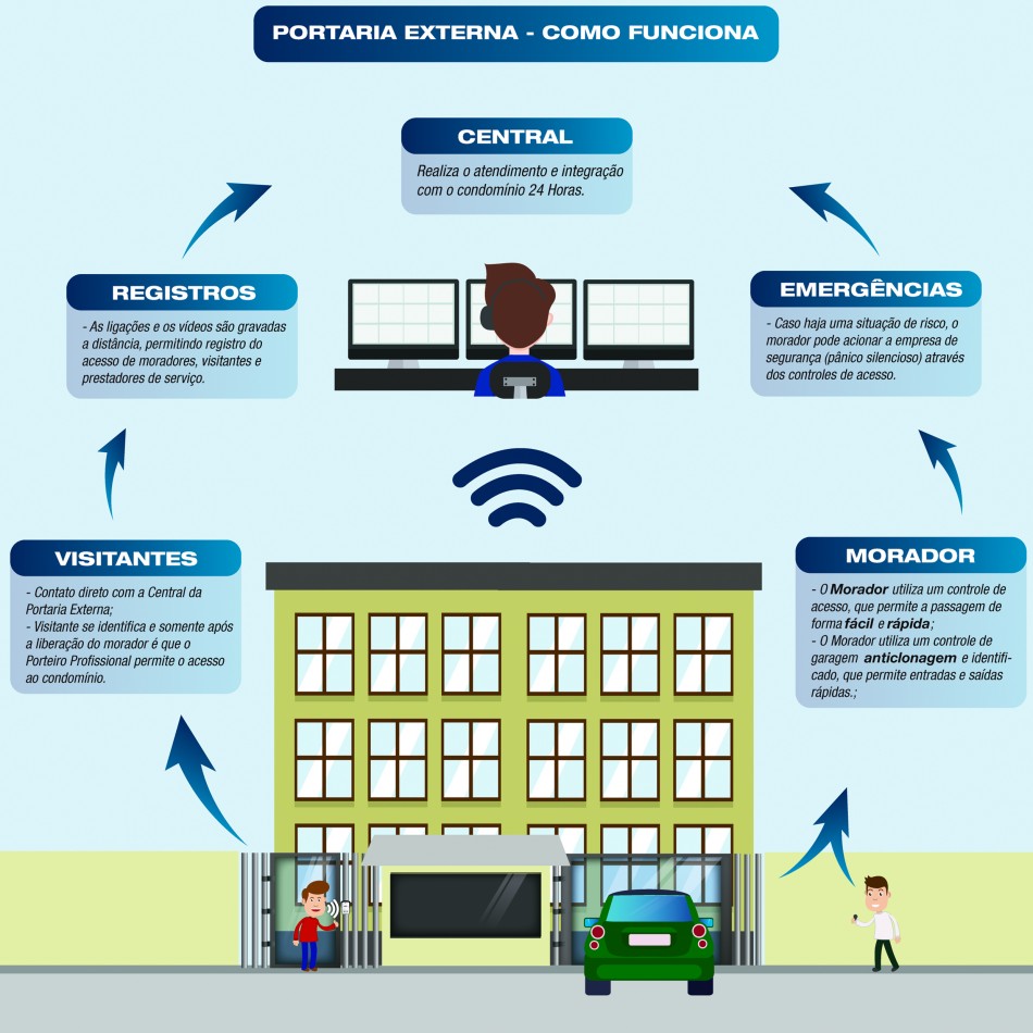 – Visitantes: Ao chegar ao condomínio, o visitante se identifica na Portaria Externa (interfone ou totem com câmera). A ligação é direcionada diretamente à Central de Monitoramento.